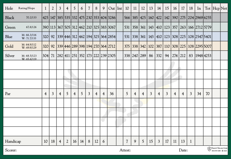 | Yardage: | 6,255 (Black), 5,779 (Green), 5,401 (Blue), 5,007 (Gold), 4,253 (Silver) |