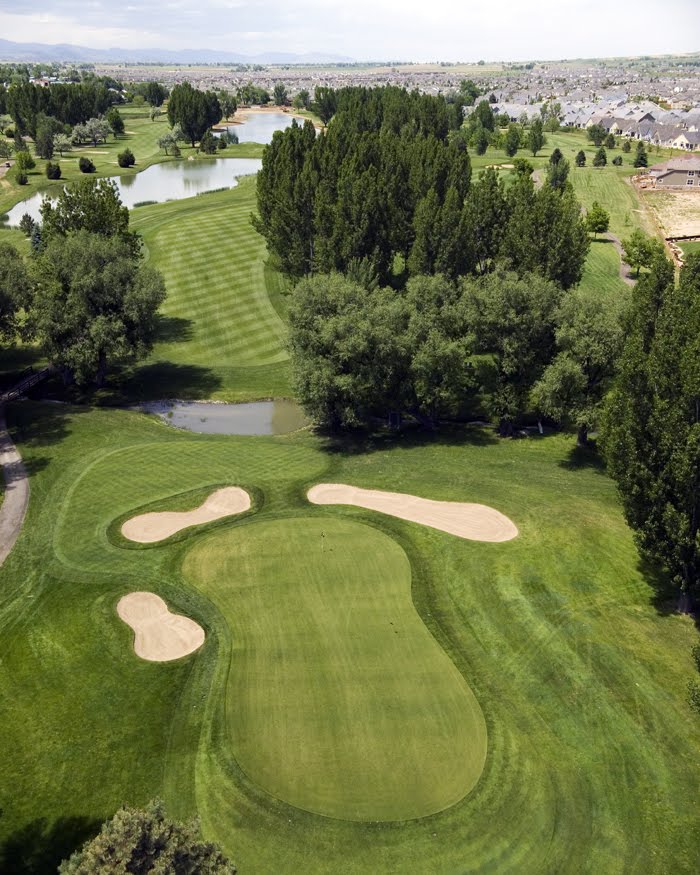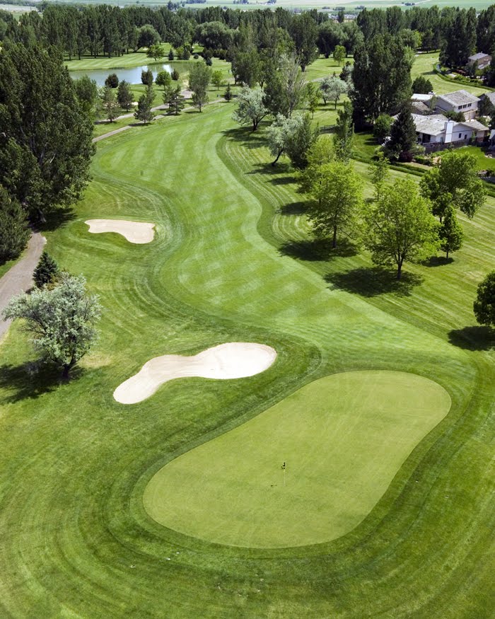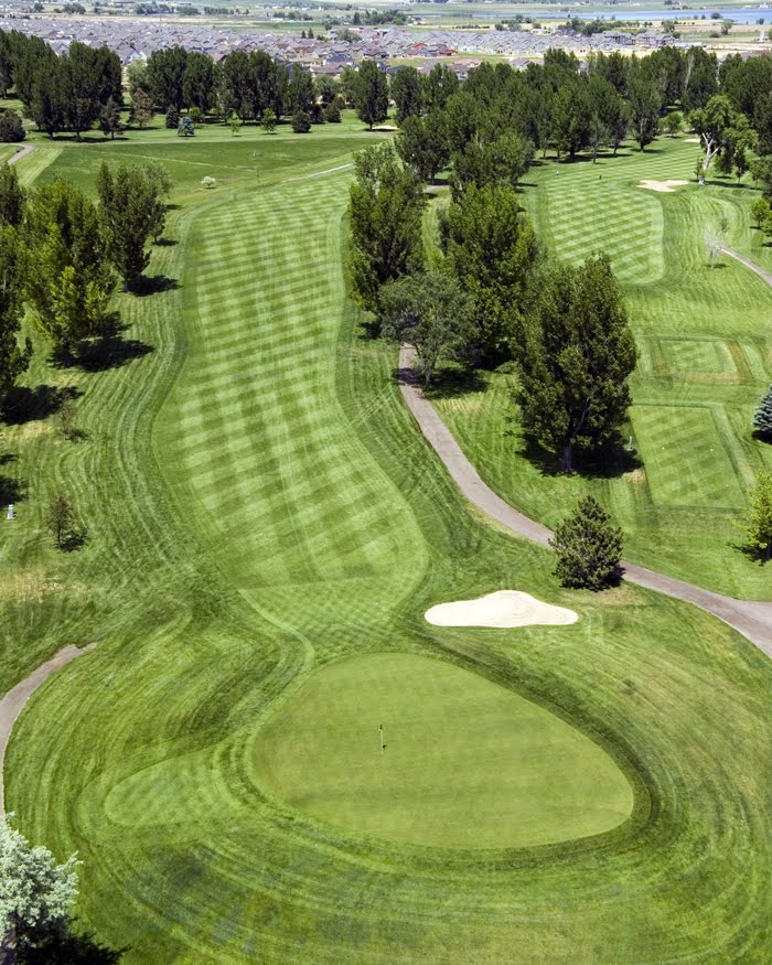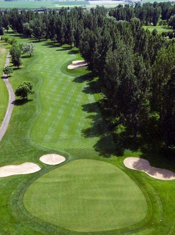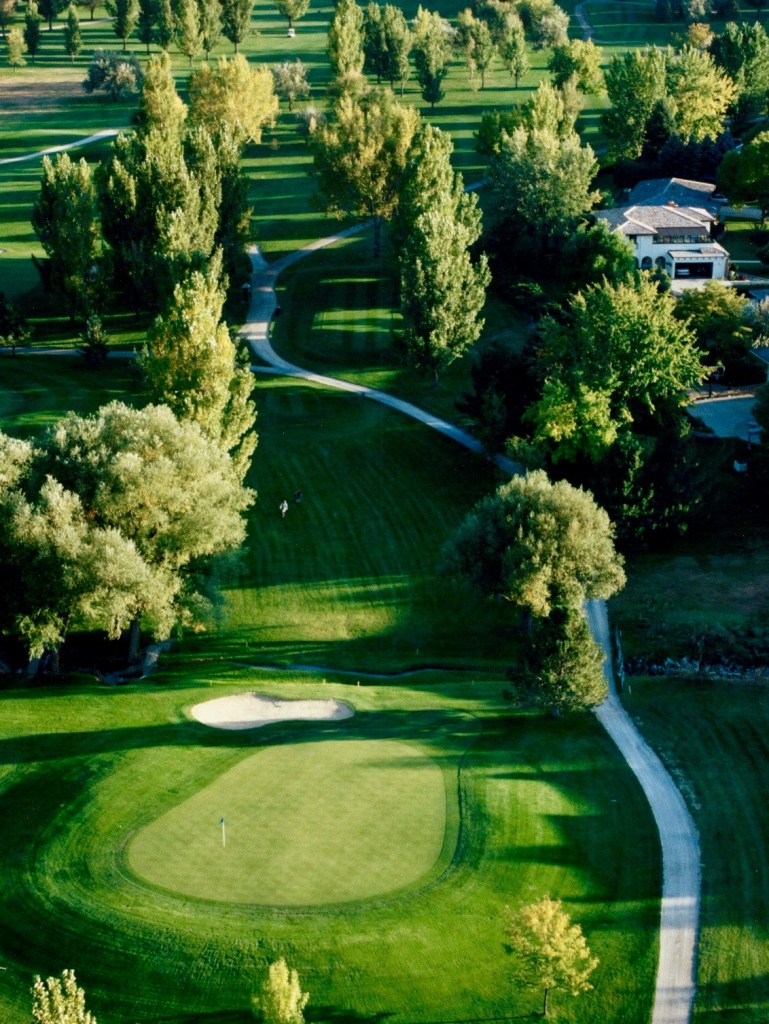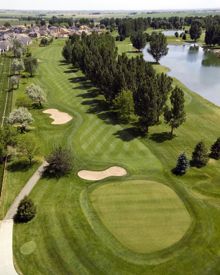 Hole #17 is the last Par 3 of the course. The average distance is about 170 yards to a large green. However, a deep bunker guards the front; long shots will find the water behind the green: and a mature cottonwood will knock down shots to the right. With the only bailout on the left, it makes for tough shot down the stretch as you are finishing your round.