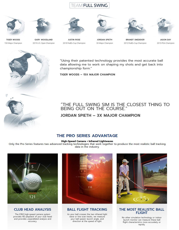 Tiger Woods, Justin Rose, Jordan Speith and many other top PGA Professionals only trust Full Swing Golf Pro Series Simulators. Not only are they the most accurate golf simulator currently on the market, they are also the most fun and exciting to play. We have over 84 world Famous championship courses to choose from, along with an interactive driving range to hone in your carry distances or diagnose and correct your existing swing flaws.