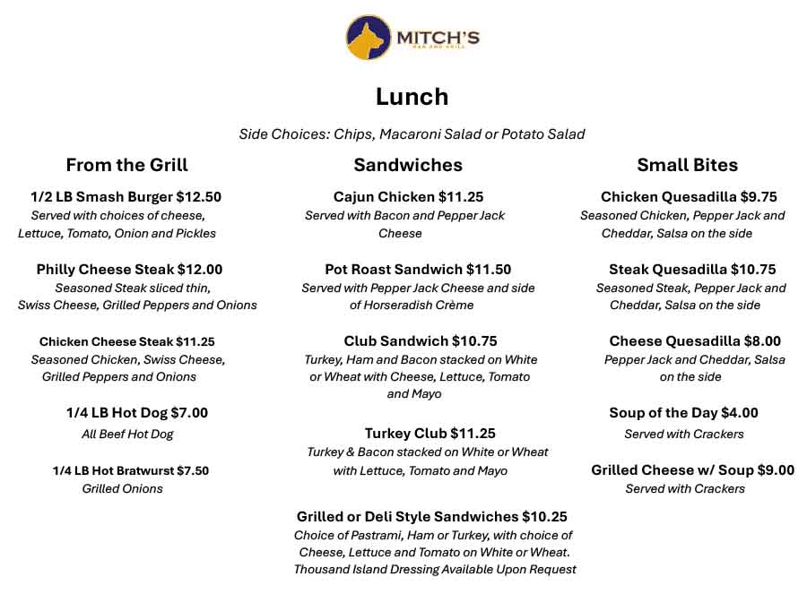 Contact our Food & Beverage Manager to set up box lunches or a catered meal for your group. We can organize to have your lunch brought to you on the course or ready for you in Mitch’s Grill, the patio or the scoring lawn before or after your round.